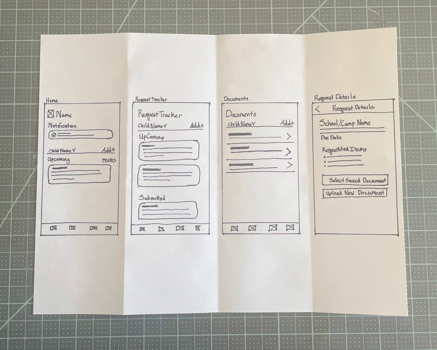 Sketching multiple versions of each screen on paper allowed me to explore layout options and ensure the digital wireframes addressed key user needs. This included designing multiple entry points to the request details page, and making it easy to switch between children or add a new child.